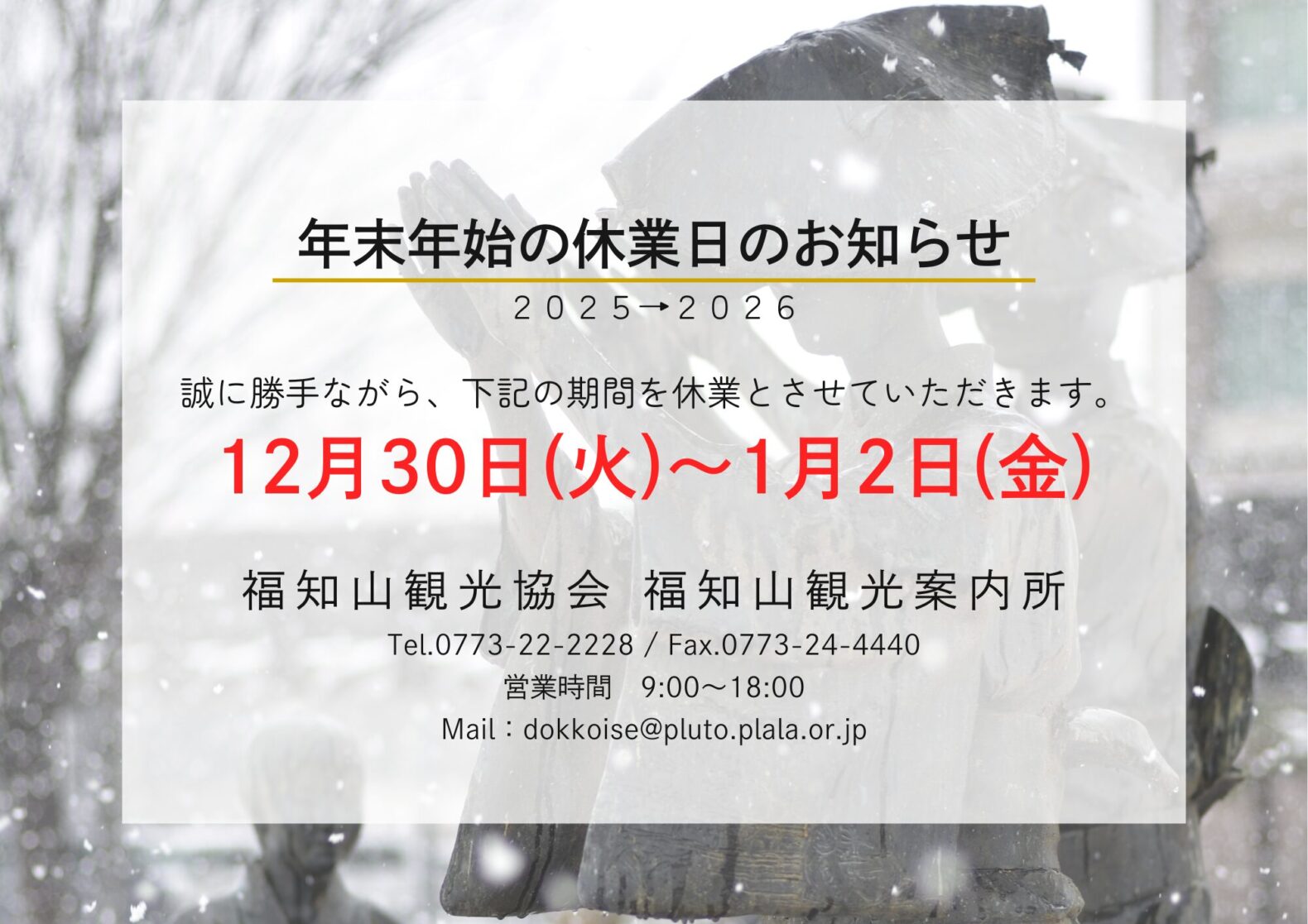 Webフォーム<外部リンク><外部リンク>、または福知山市役所商業観光課へ電話、Fax、メール