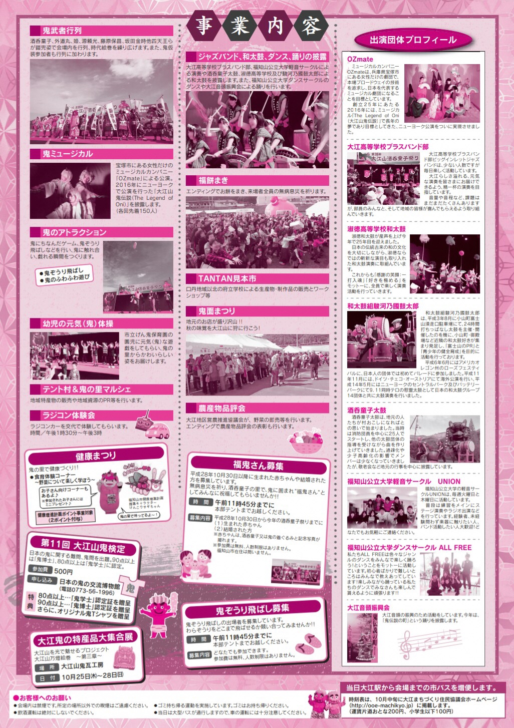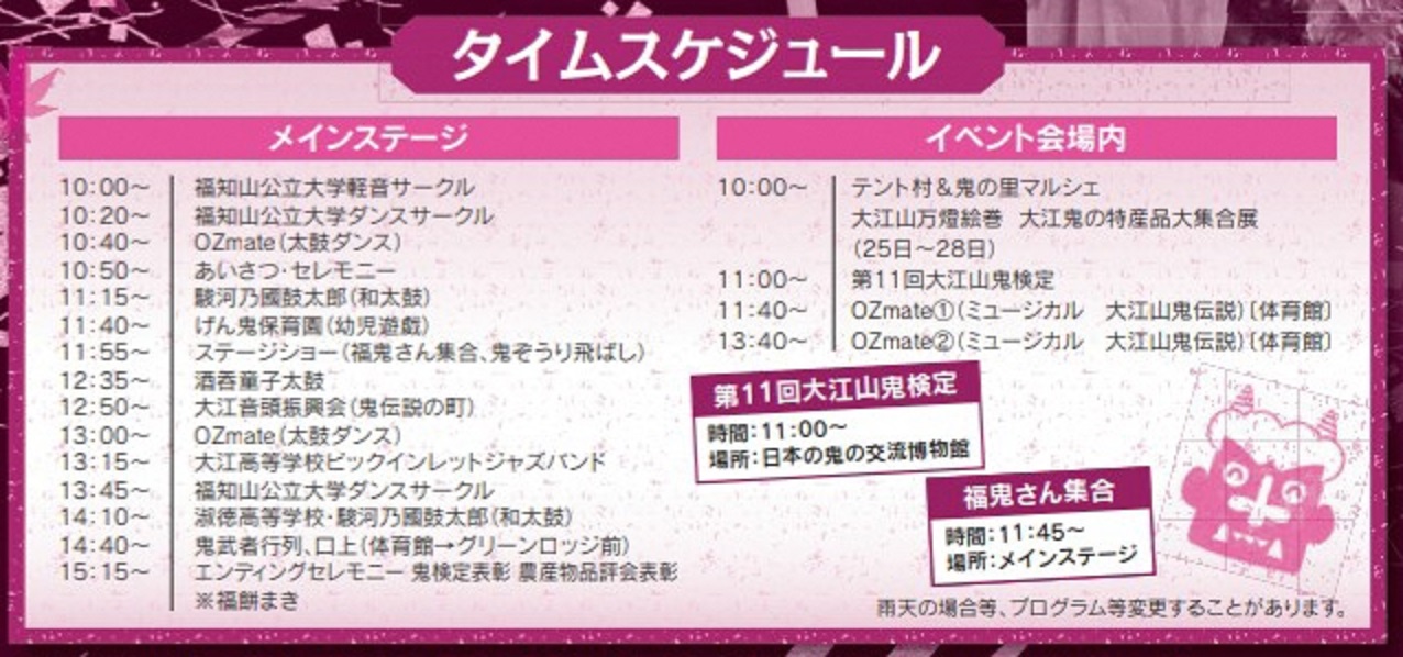 鬼伝説で有名な「大江山」を舞台に、鬼退治をした源頼光をはじめとする武者行列、日本唯一の「鬼」をテーマにした「大江山鬼検定」など様々な催しが行われます。