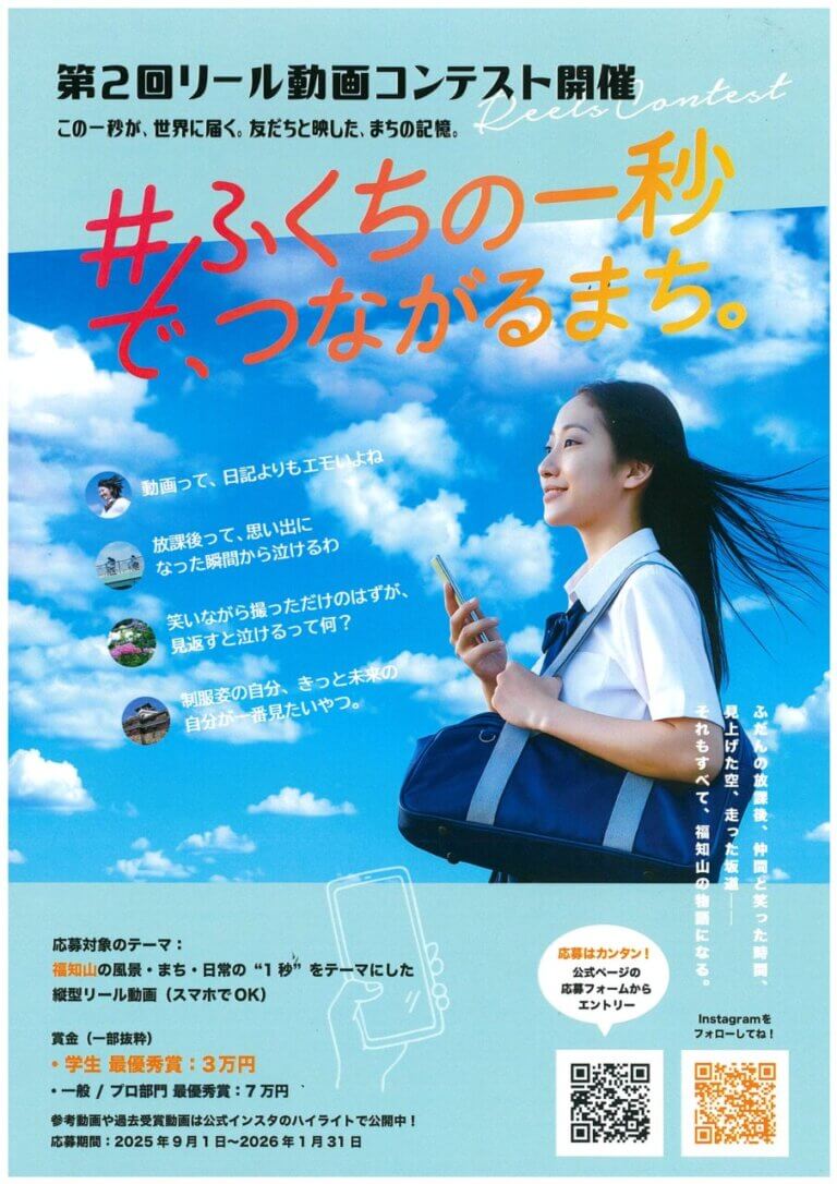 続きを読む>>福知山観光協会では、学生(高校生・大学生)を対象とした 「第2回学生向けビデオコンテスト」を開催します。 現在、リール動画作品の募集を行っています。 募集テーマ 「この一秒が、世界に届く...