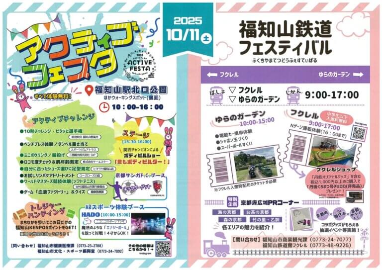 続きを読む>>令和7年10月11日(土)に市内で開催される3つのイベント についての情報です。 ◎当日は、3フェス合同企画 スタンプラリーも開催されます 「福知山鉄道フェスティバル」 開催時間:9:0...